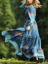 Slim Long-sleeved Blue Vintage Bohemian Dress