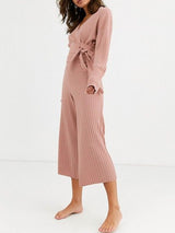 Casual Loose V-Neck Strap Long Sleeve Wide Leg Pants Knitted Suit