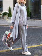 Loose Casual Long Sleeve Pocket Pullover Pants Coat Three Knit Set