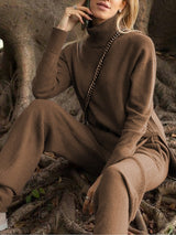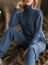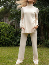 Loose Casual Turtleneck Long Sleeve Pullover Wide Leg Pants Knitted Suit